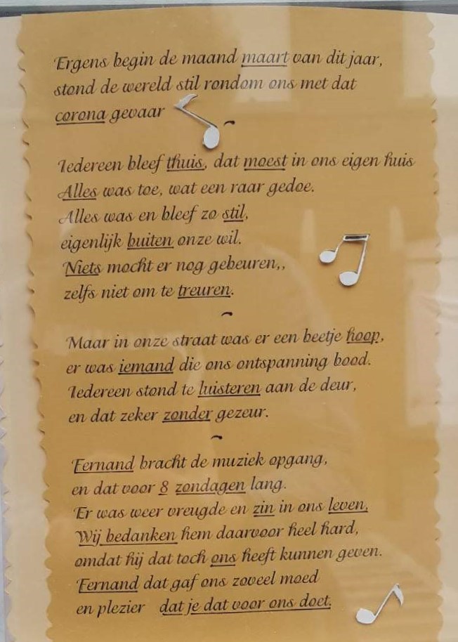 Met enkele buren zijn we blijven doorgaan met klappen. En nu heeft Sonia de taak en muziekinstallatie van Fernand over genomen. Dus weer muzikaal applaus moment alle dagen om 20u