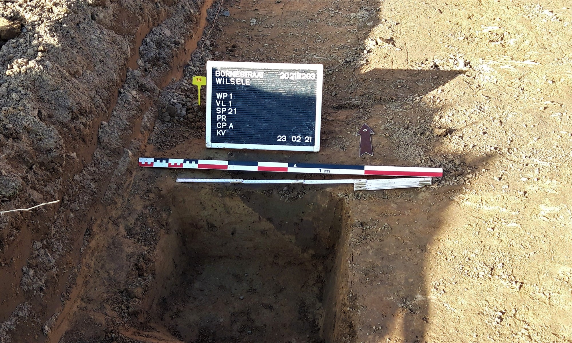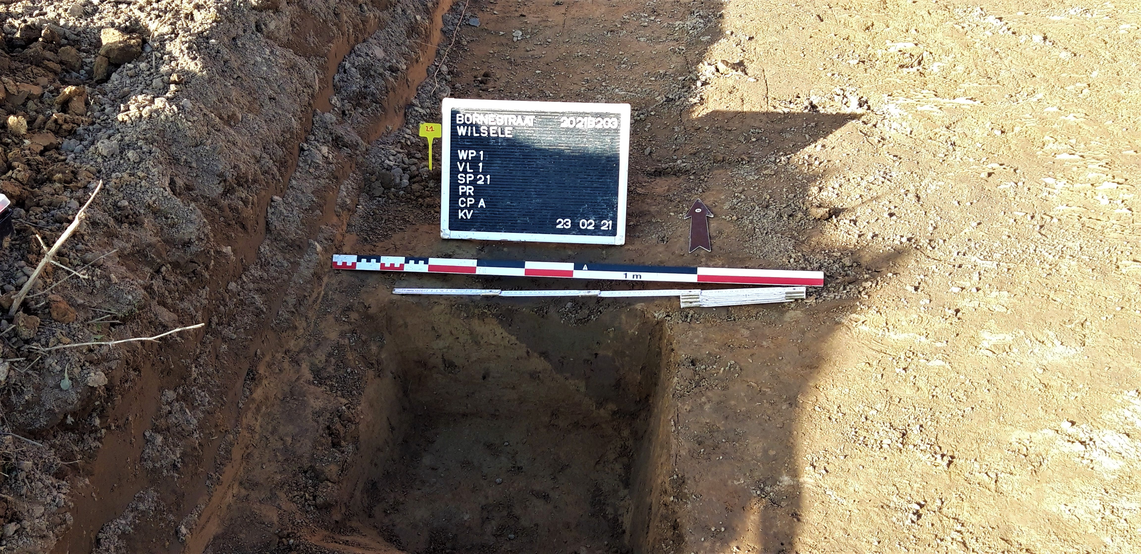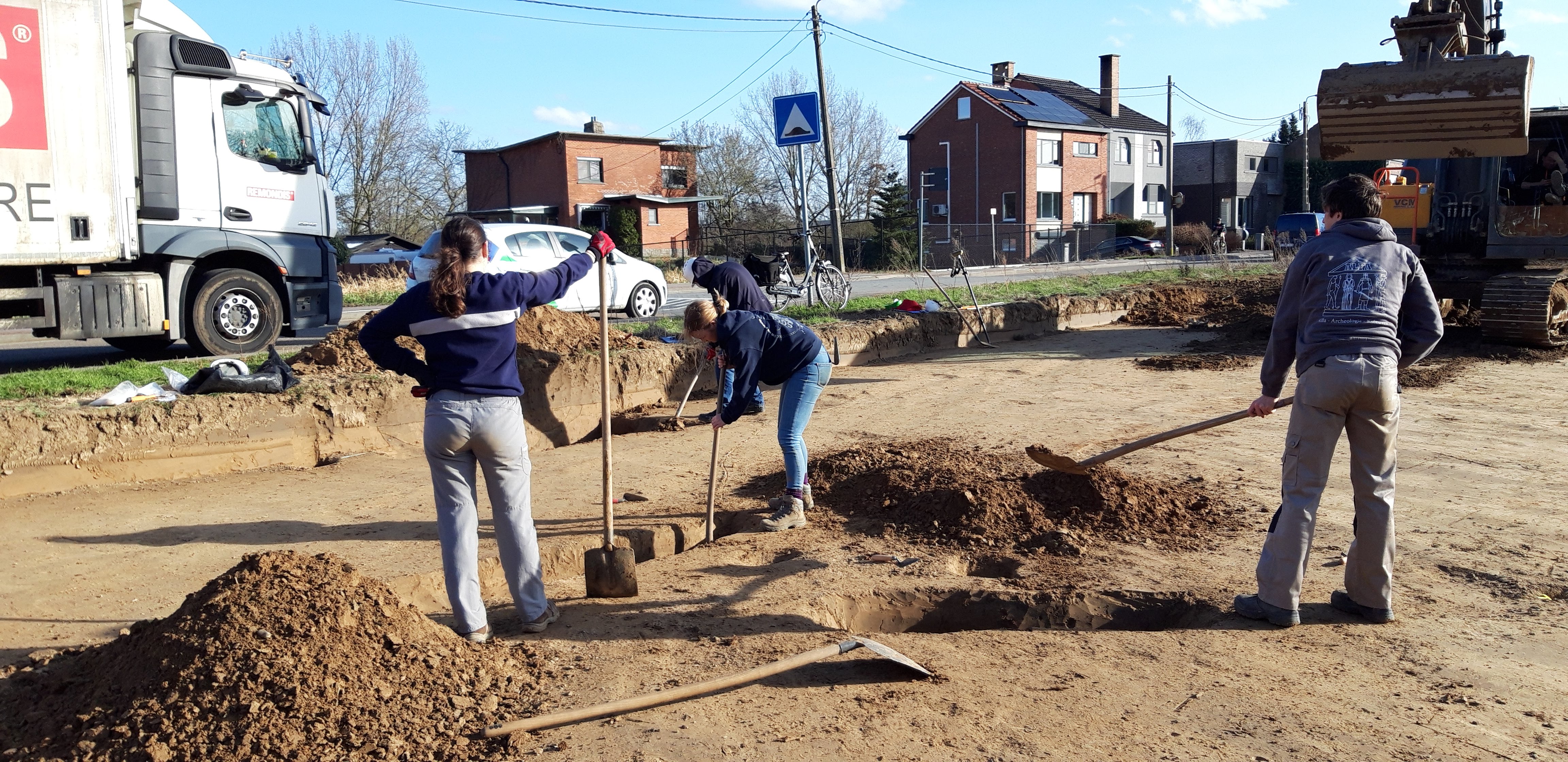 Sinds enkele dagen zien we ongewone bedrijvigheid op het veld tussen Bornestraat nummer 63 en nummer 79: een opgraving! Je kan er nog heel de week en (een deel van) volgende week archeologen aan het werk zien. Zij vonden er al een loopgraaf. Hopelijk kan het verdere onderzoek meer info geven over de datering ervan. En wie weet welke verhalen er nog te vinden zijn in de ondergrond…