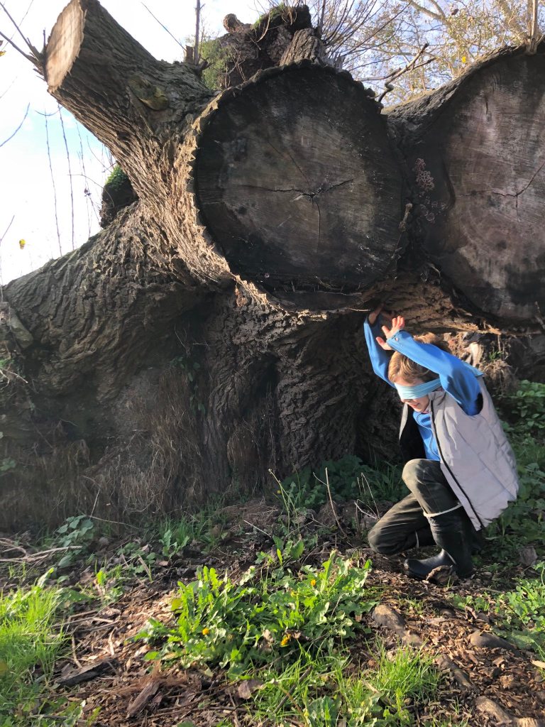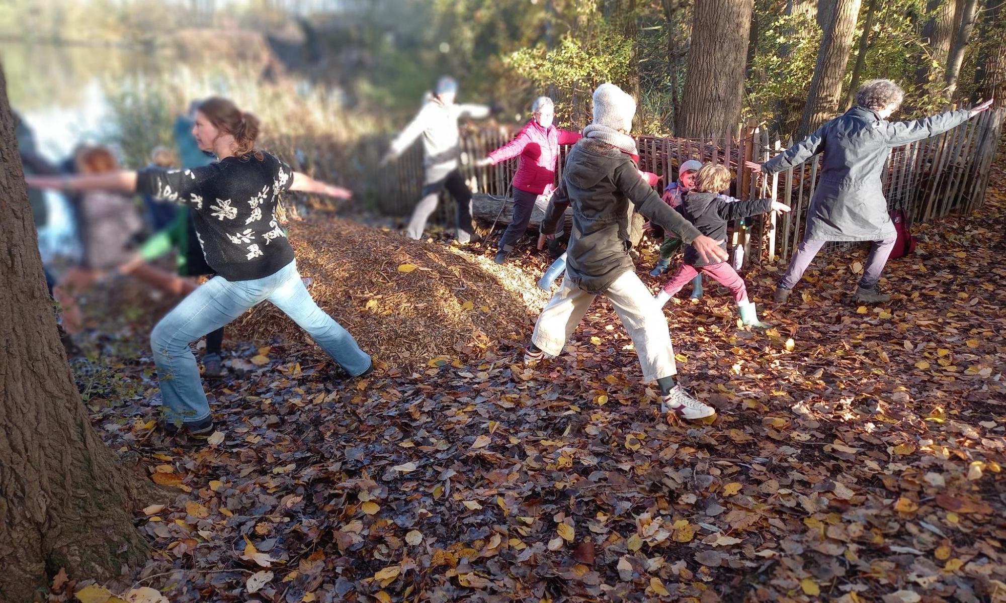 De kinderen (en ouders) zoeken naar kriebelbeestjes op de bomen en in de modder, en speuren naar aalscholvers, reigers en beversporen. In een uitdagend parcours op, over en onder bomen balanceren ze en gooien ze om ter verst met stokken. Ouders en grootouders bouwen mee aan een slang van bladeren en takjes. Tijdens het yoga-momentje voelen ze het bloed tintelen door hun lijf, net zoals de sapstroom van de boom hevig stroomt in de lente. En ze moeten stevig staan als een boom tijdens de storm, op één been.